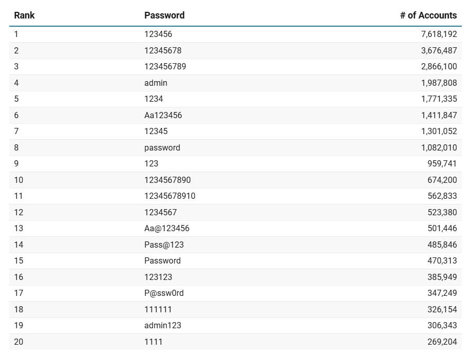 The "leaders" list includes not only classics like "admin" and "password" but also numeric sequences from 1 to 9. Newer variations have also cracked the top 100, including "Aa123456" in sixth place and "Aa@123456" in thirteenth place.