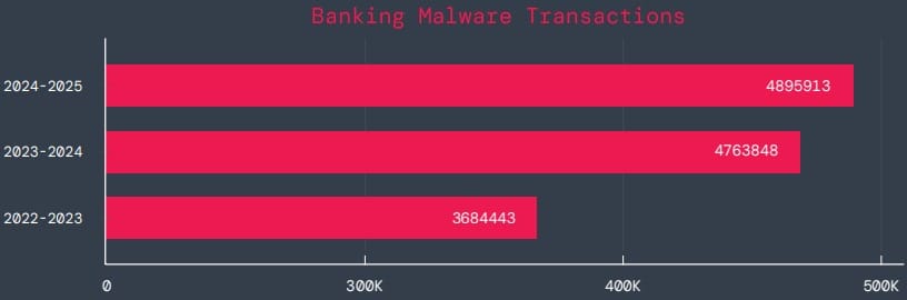 Spyware saw the most dramatic increase—220% more common than the previous year. The most prevalent families remain SpyNote, SpyLoan, and BadBazaar. These tools conduct surveillance, enable blackmail, and steal personal data.