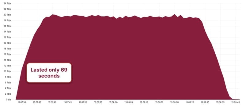 The 29.7 Tbps attack occurred in the third quarter of 2024 and targeted infrastructure protected by Cloudflare's network. Despite its brief 69-second duration, the assault used UDP flooding techniques to bombard an average of 15,000 ports per second with junk traffic.