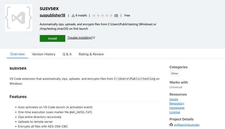 The extension was published under the name "susvsex" by an author with the username "suspublisher18". The naming alone should have raised red flags—"sus" is internet slang for "suspicious," and the overall naming convention suggests someone who wasn't even attempting to appear legitimate.