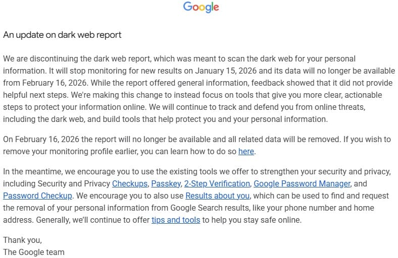 Google will shut down Dark Web Report, a service that alerted users about data breaches, in mid-February 2026. The company cited the tool's lack of actionable recommendations as the reason for closure.
