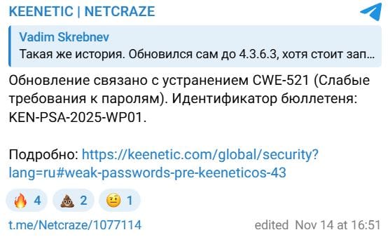 In early November, Keenetic published security bulletin KEN-PSA-2025-WP01 describing a CWE-521 vulnerability (Weak Password Requirements) with a CVSS score of 8.8. The flaw affected Keenetic devices running KeeneticOS versions below 4.3.