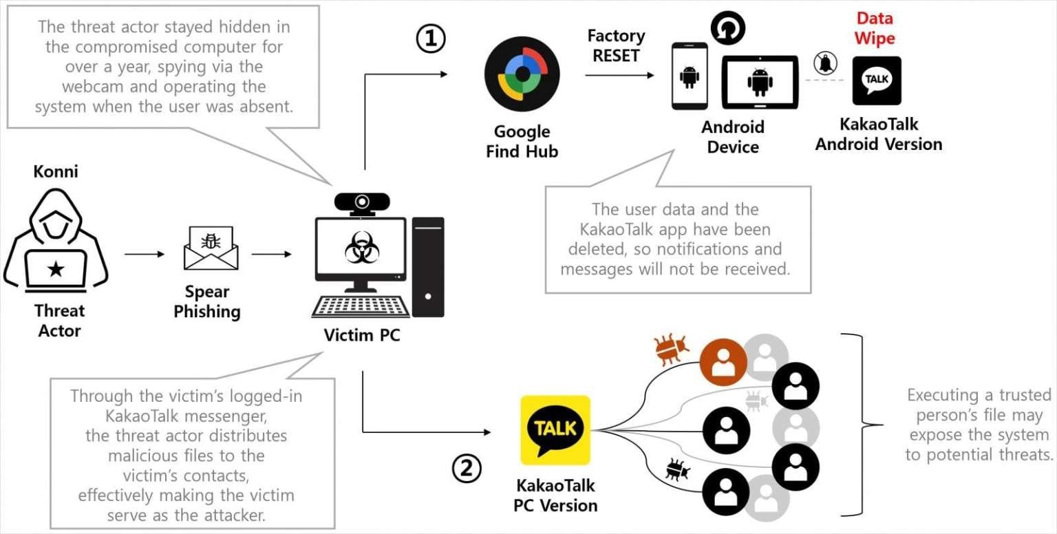 Cybersecurity firm Genians reports that these attacks target South Korean users through KakaoTalk, a popular local messaging platform. The attackers first infect victims' computers with remote access trojans (RATs), then leverage stolen credentials and Google's legitimate device management tool to destroy data on linked Android devices.