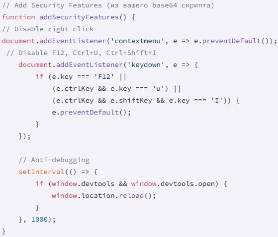 The malicious code employed multiple anti-analysis techniques. It blocked right-clicks, F12, and key combinations Ctrl+U and Ctrl+Shift+I. When DevTools detection occurred, the script simply reloaded the page. Simultaneously, the malware performed browser fingerprinting, collecting information about user agent, language, protocol, host, referrer, URI, query parameters, encoding, and other identifying data. The code transmitted all collected data to the attackers' proxy server while sending victims' real IP addresses to the Adspect API.