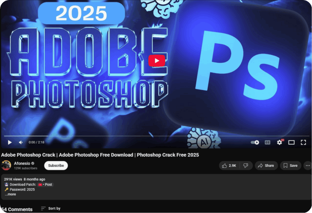 In one documented case, a compromised channel with 129,000 subscribers posted a video advertising a cracked version of Adobe Photoshop. The video accumulated nearly 300,000 views and over 1,000 likes before removal, demonstrating how hijacked reputation can amplify reach.