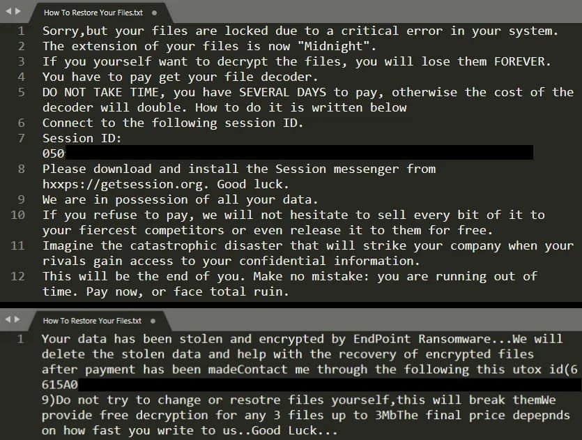 On compromised systems, encrypted files receive either .midnight or .endpoint extensions, and sometimes this marker appears embedded in file content. Victims find a standard ransom note (How To Restore Your Files.txt) and occasionally operation logs named report.midnight or debug.endpoint showing the malware's execution details.