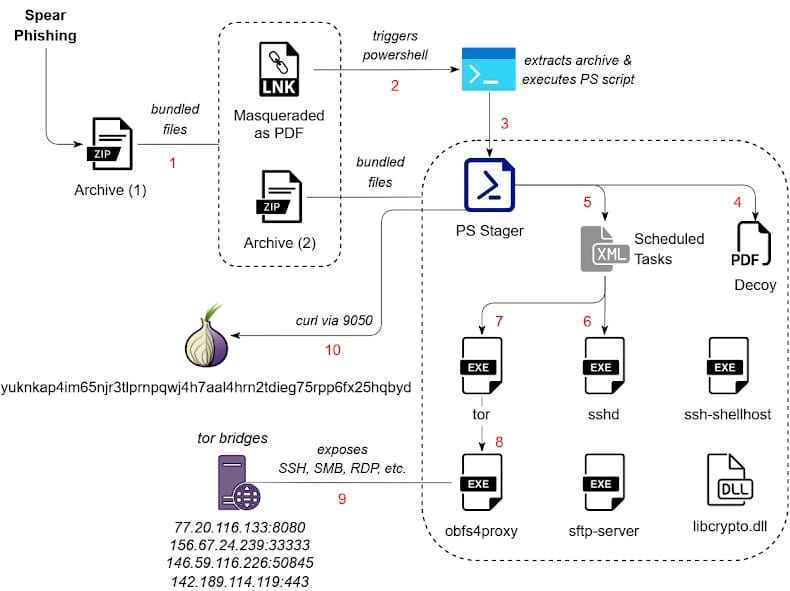 "The attackers gain access to all critical services through Tor hidden services, ensuring complete control over the system while maintaining anonymity. All communications are routed through anonymous addresses using pre-installed cryptographic keys," the researchers state in their report.