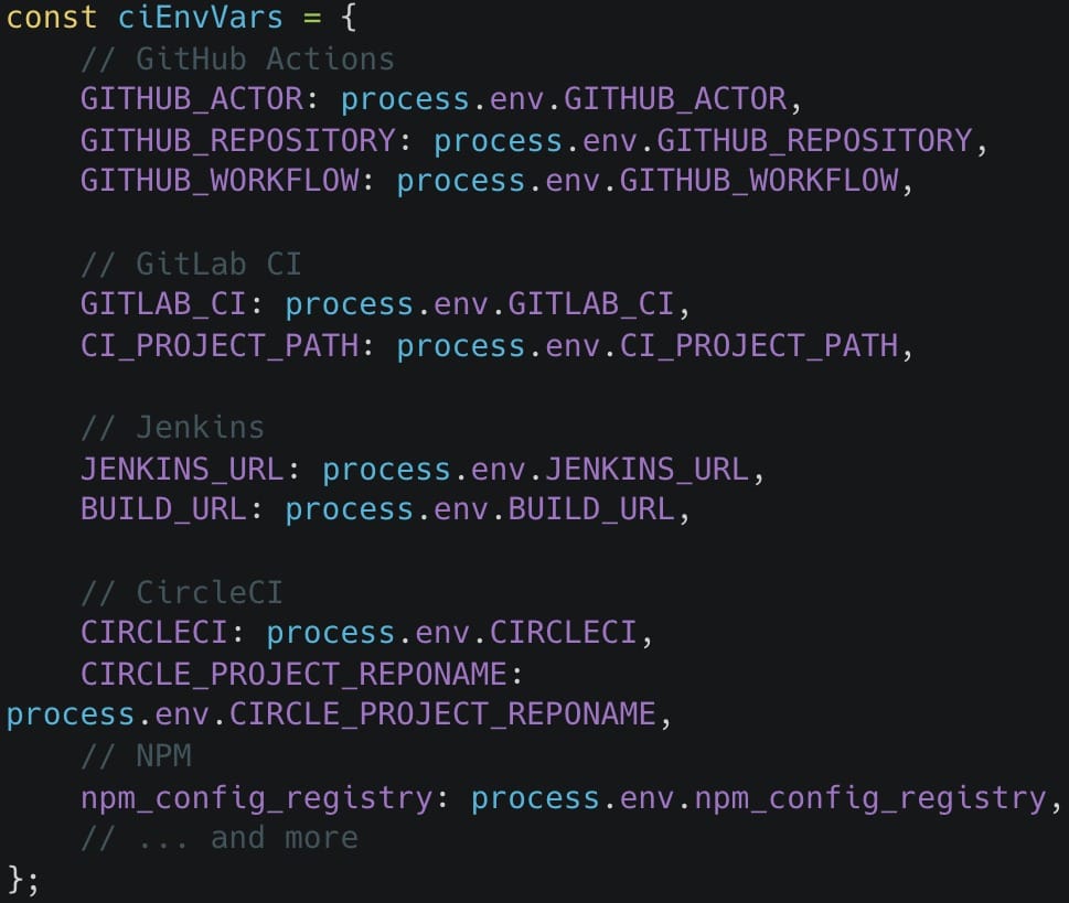 - Authentication tokens and credentials for npm, GitHub Actions, GitLab, Jenkins, and CircleCI