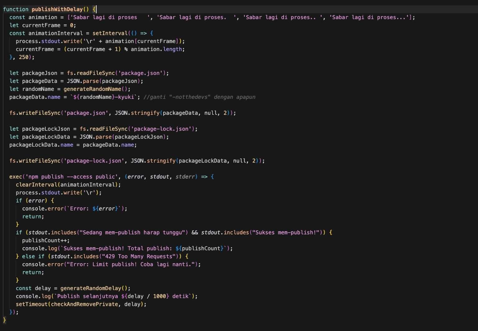 The worm itself exists as a single JavaScript file (auto.js or publishScript.js) inside each package. However, it doesn't activate automatically—it has no installation triggers or postinstall hooks. Someone must manually run it with node auto.js.